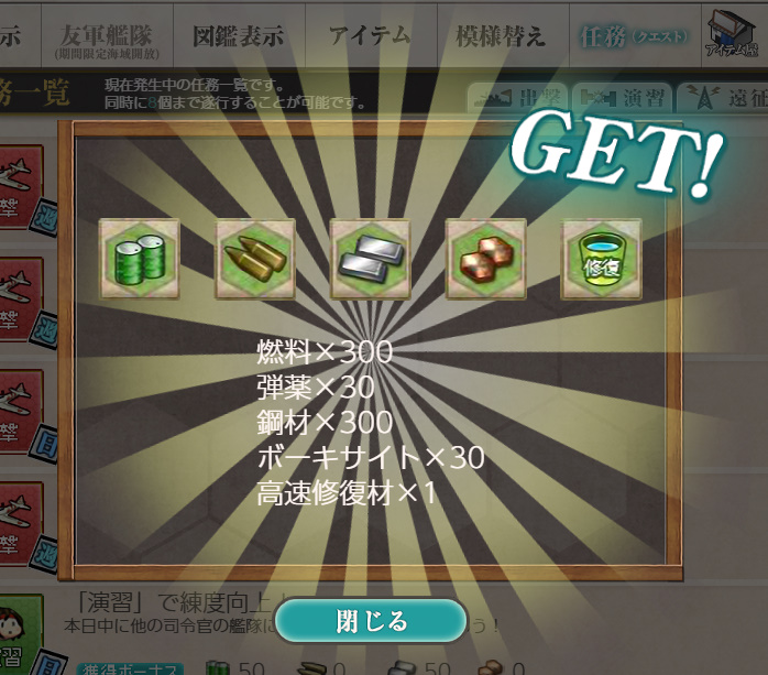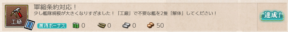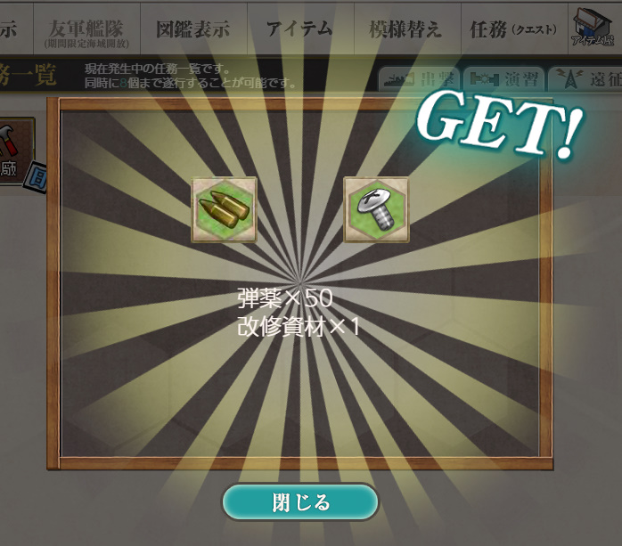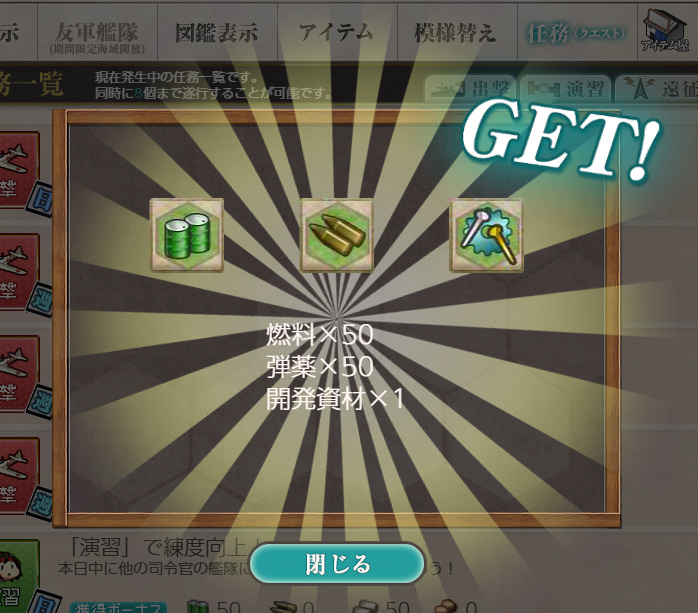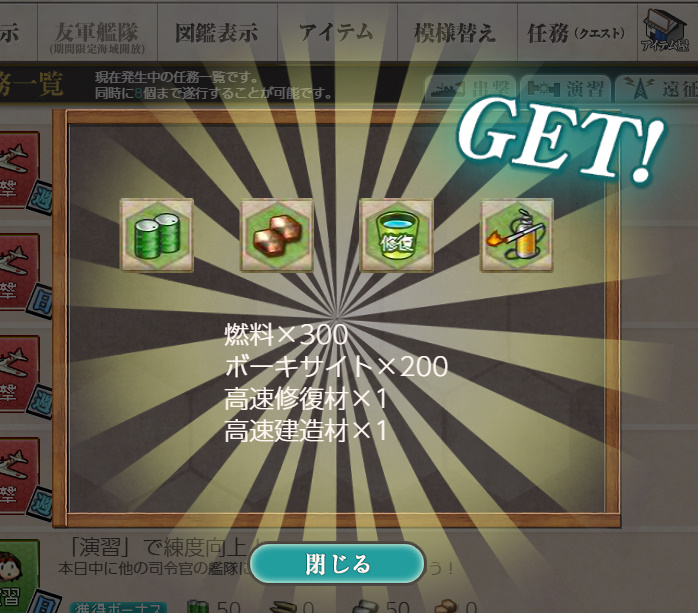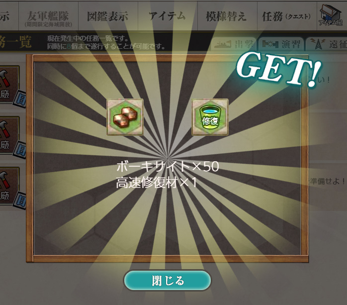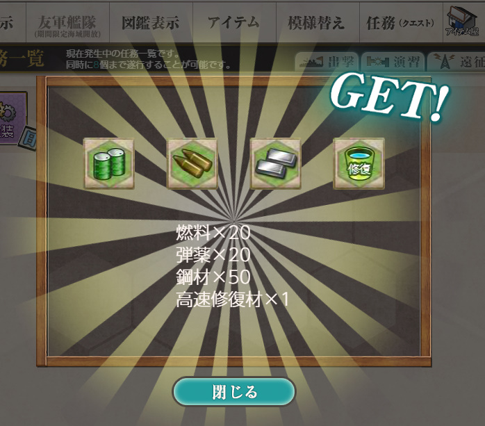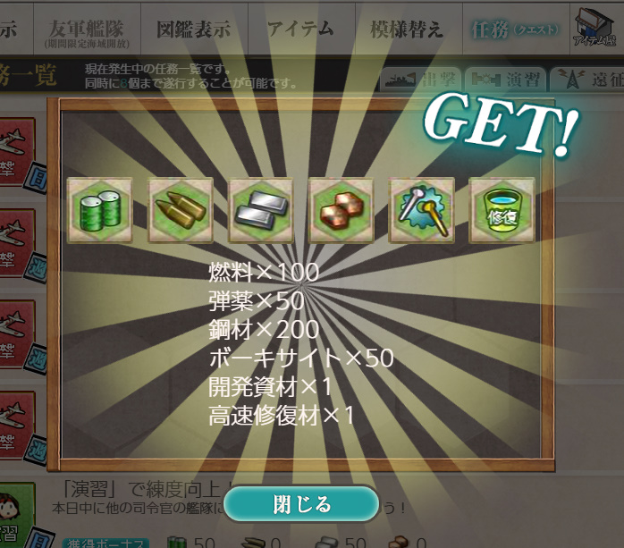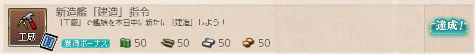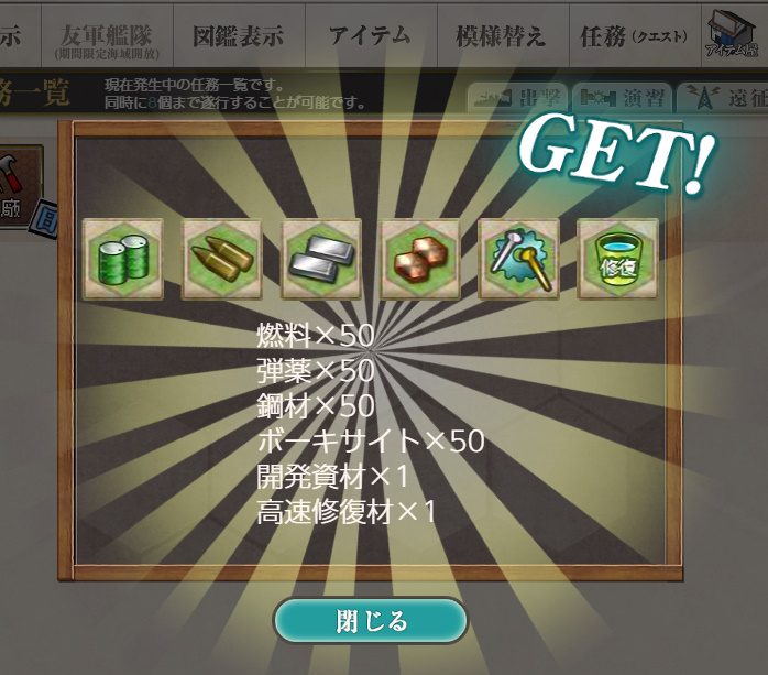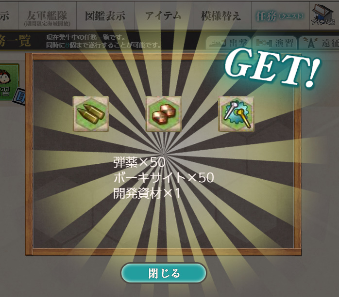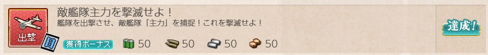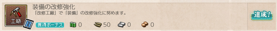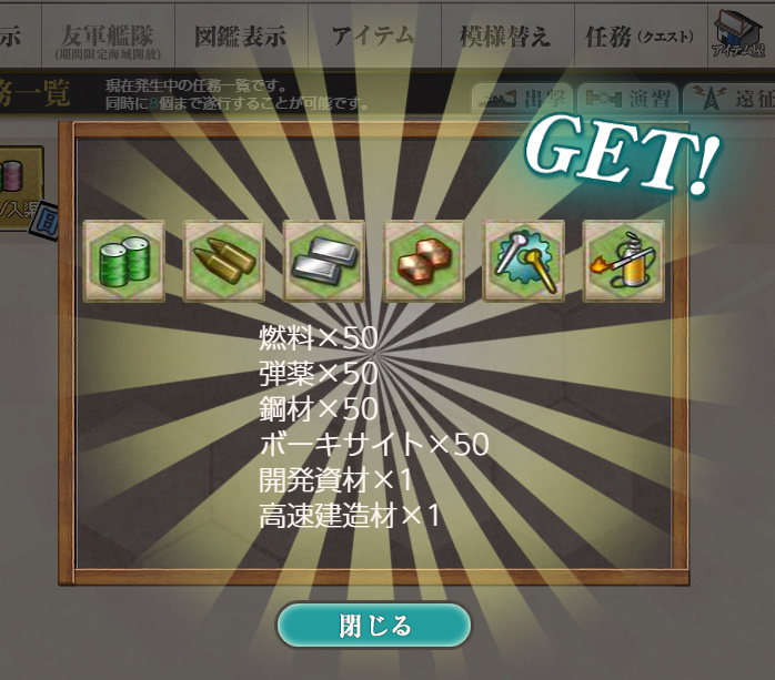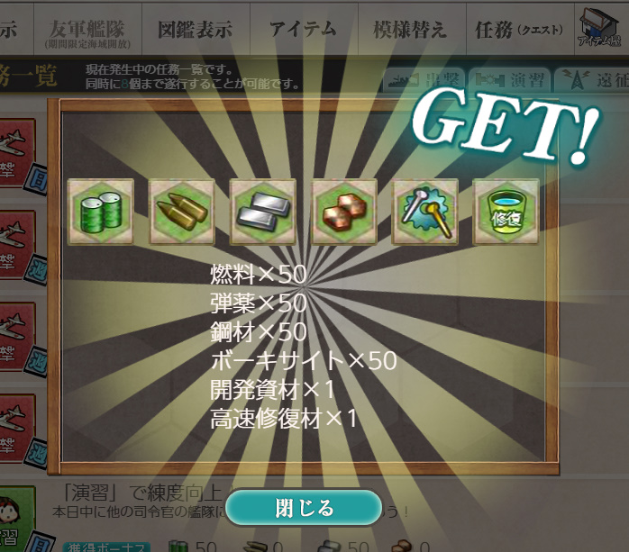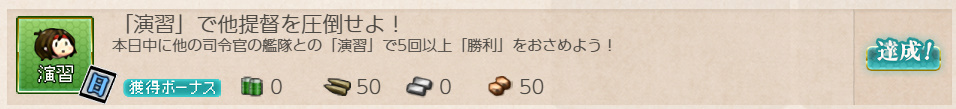 - 報酬:燃料×50、弾薬×50、鋼材×50、ボーキサイト×50、開発資材×1、高速修復材×1