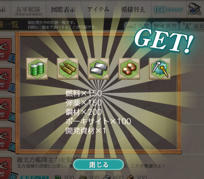 - 報酬:燃料×150、弾薬×150、鋼材×200、ボーキサイト×100、開発資材×1