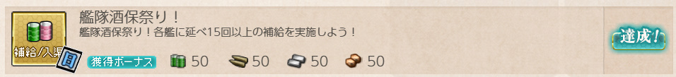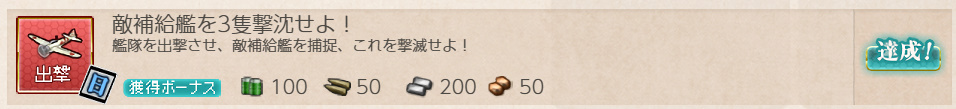 ※燃料、弾薬、艦載機をわけて補給する場合、一回一回回数が加算される - 報酬:燃料×50、弾薬×50、鋼材×50、ボーキサイト×50、開発資材×1、高速建造材×1