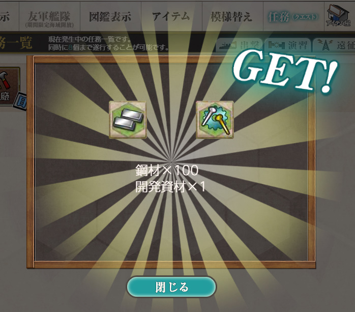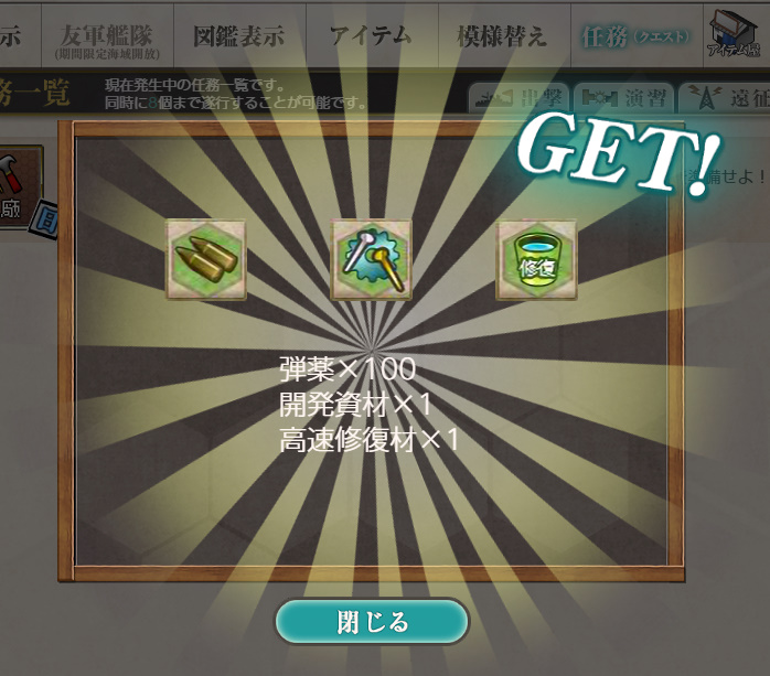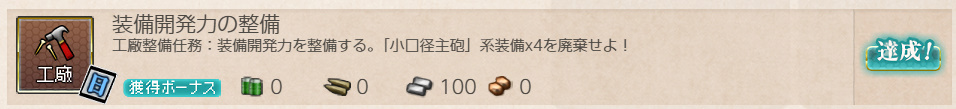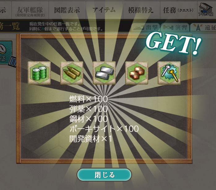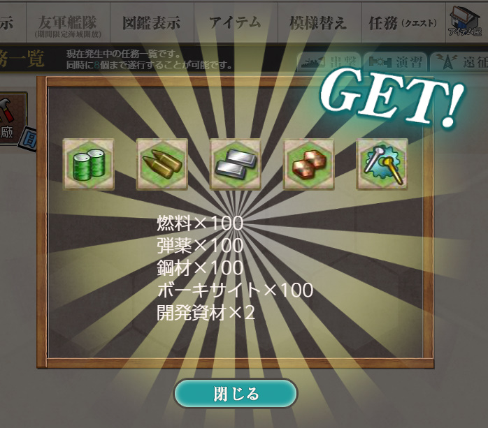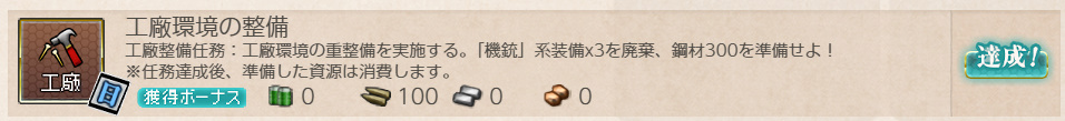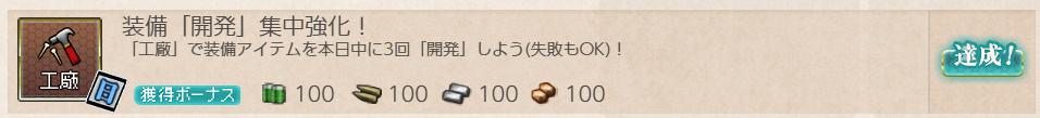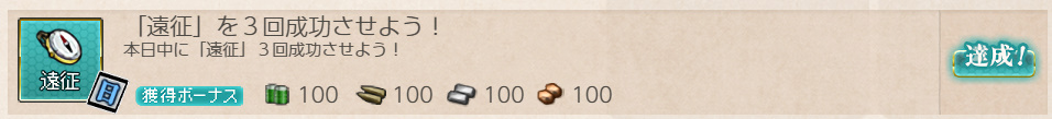 - 報酬:燃料×100、弾薬×100、鋼材×100、ボーキサイト×100、開発資材×1