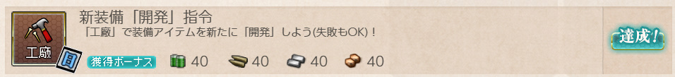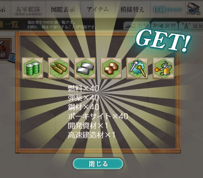 - 報酬:燃料×40、弾薬×40、鋼材×40、ボーキサイト×40、開発資材×1、高速建造材×1