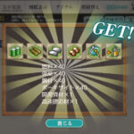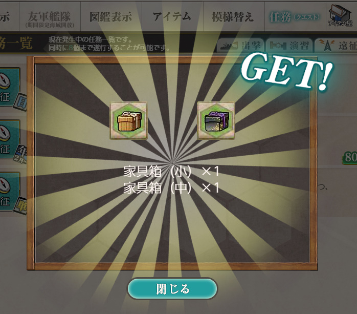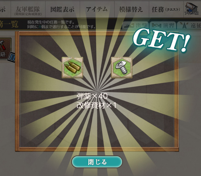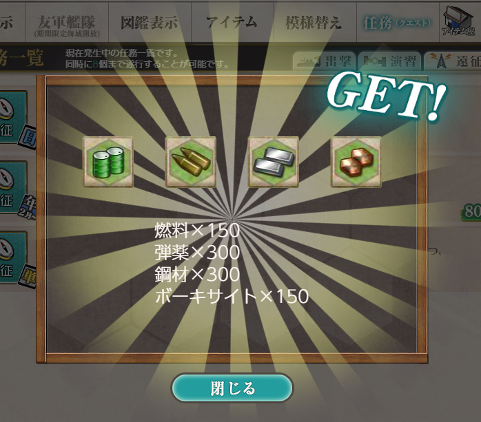 - 報酬:燃料×150、弾薬×300、鋼材×300、ボーキサイト×150、家具箱(小)×1、家具箱(中)×1