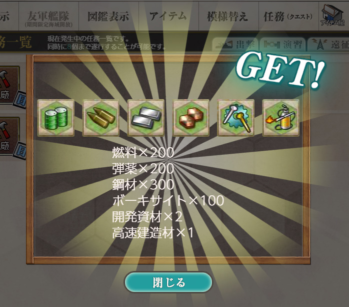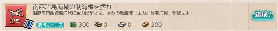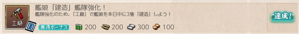 - 報酬:燃料×200、弾薬×200、鋼材×300、ボーキサイト×100、開発資材×2、高速建造材×1