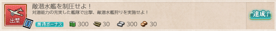 - 報酬:燃料×300、弾薬×30、鋼材×300、ボーキサイト×30、高速修復材×1