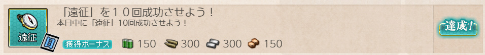 - 報酬:燃料×150、弾薬×150、鋼材×150、ボーキサイト×300、高速修復材×2