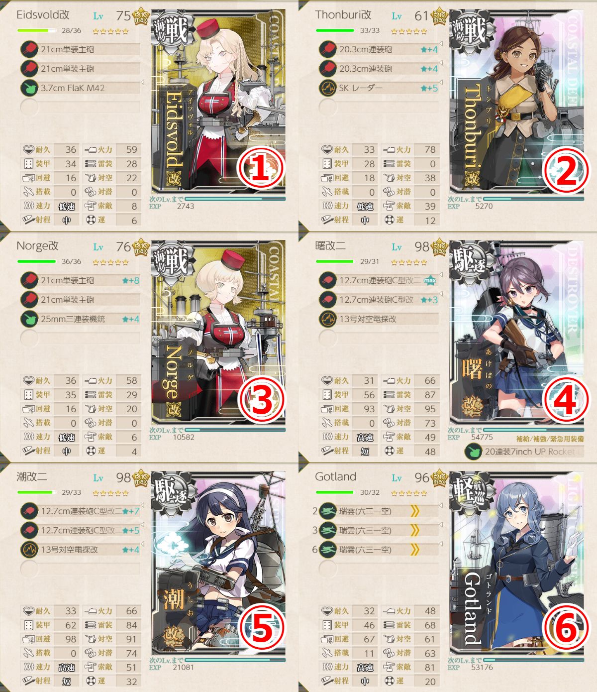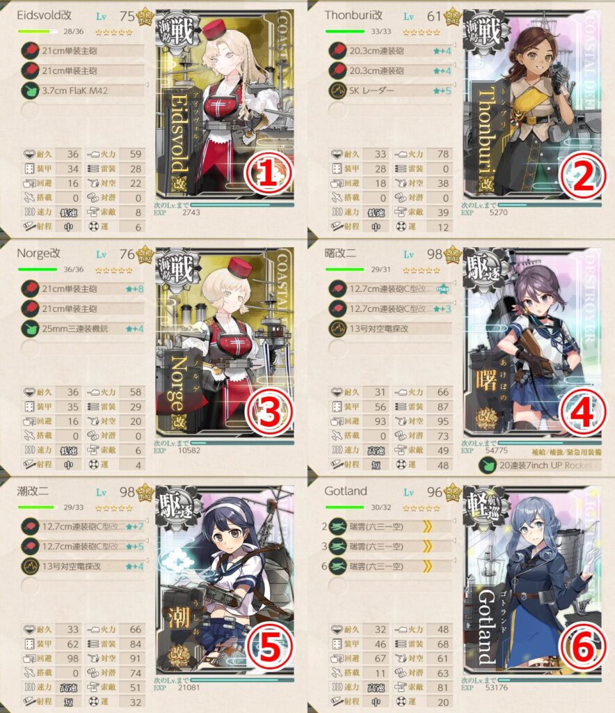こちらも海防戦艦さんたちと第七駆逐艦の改二のお二人です
