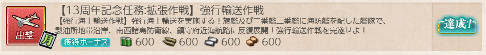 艦これ 任務 「【13周年記念任務:拡張作戦】強行輸送作戦」【期間限定/出撃/マンスリー】