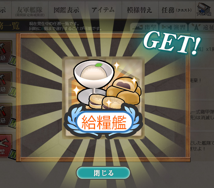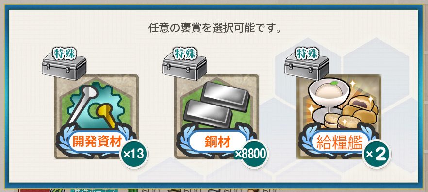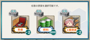 - 開発資材×13 or 鋼材×8800 or 給糧艦「間宮」×2